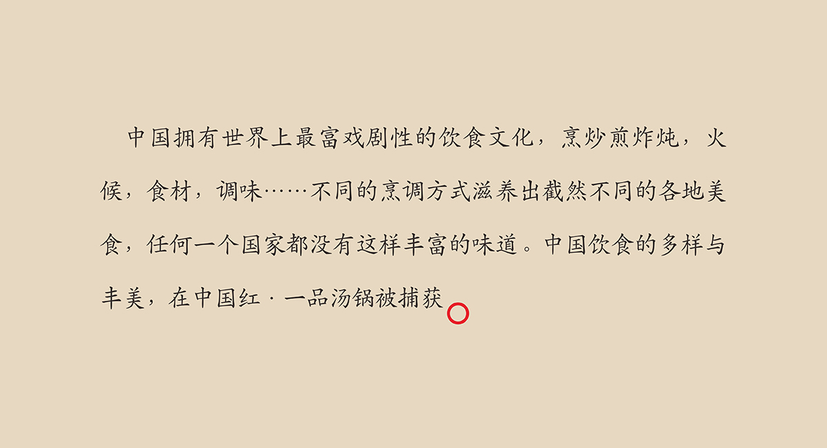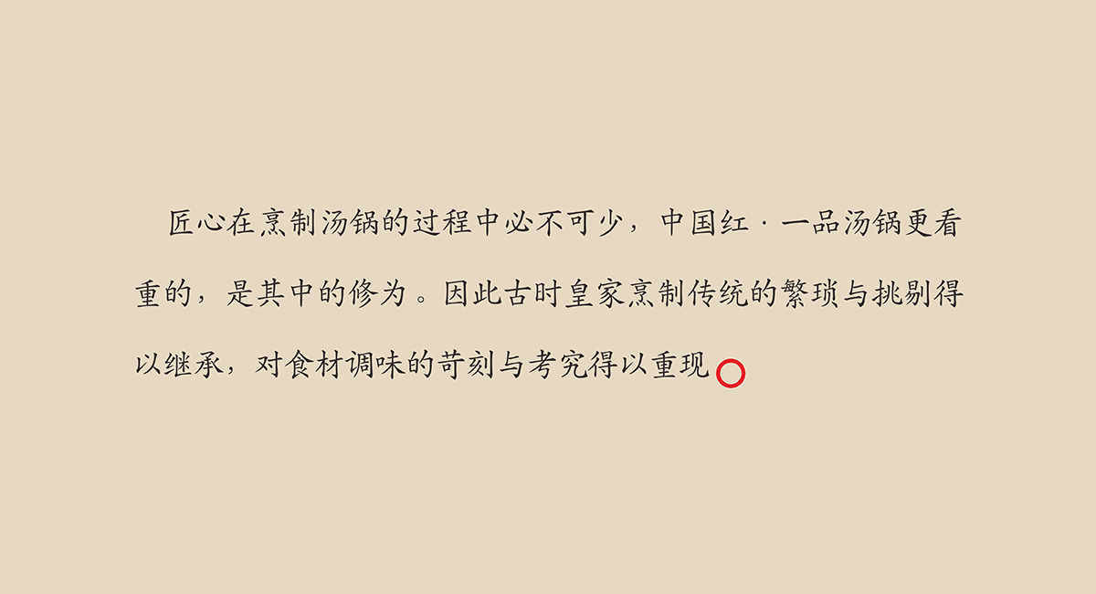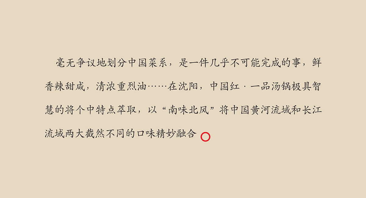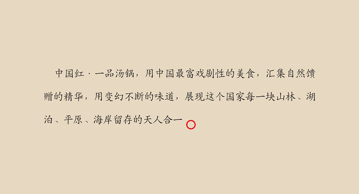 中國(guó)紅·一品湯鍋是沈陽(yáng)中國(guó)紅餐飲打造的高端湯鍋品牌。產(chǎn)品以中國(guó)北派湯鍋養(yǎng)生為魂,中國(guó)南派火鍋味道為基,中國(guó)紅·一品湯鍋開創(chuàng)“皇傳尚品”的遼派湯鍋大美之味。成都九一堂商業(yè)空間設(shè)計(jì)用文化提升消費(fèi)體驗(yàn), 中國(guó)紅·一品湯鍋以“用匠心熬制一品湯鍋”為責(zé)任,承襲百年湯鍋精湛技藝,以秦漢唐宋的盛世文化為載體,打造足以代表中國(guó)湯鍋文化于歷史精萃的品牌。 中國(guó)擁有世界上最富戲劇性的飲食文化,烹炒煎炸燉,火候,食材,調(diào)味……不同的烹調(diào)方式滋養(yǎng)出截然不同的各地美食,任何一個(gè)國(guó)家都沒(méi)有這樣豐富的味道。中國(guó)飲食的多樣與豐美,在中國(guó)紅·一品湯鍋被捕獲。 湯鍋的傳統(tǒng)由來(lái)已久,從古時(shí)帝王的庭前宴席,到普通人家的尋常一餐,湯鍋以最質(zhì)樸的食材與最多樣的味道成為中國(guó)人最具特色的飲食方式。不同的食材匯聚一鍋,有著不同的解讀:帝王品出融合與一統(tǒng);百姓嘗出團(tuán)聚與滋養(yǎng)。湯鍋的包容性自古以來(lái)都廣受追捧,推崇備至。 而中國(guó)紅·一品湯鍋從來(lái)都沒(méi)有將自己束縛在傳統(tǒng)烹制的清單上,在不斷的嘗試中尋求更深的靈感。毫無(wú)爭(zhēng)議地劃分中國(guó)菜系,是一件幾乎不可能完成的事,鮮香辣甜咸,清濃重烈油……在沈陽(yáng),中國(guó)紅·一品湯鍋極具智慧的將個(gè)中特點(diǎn)萃取,以“南味北風(fēng)”將中國(guó)黃河流域和長(zhǎng)江流域兩大截然不同的口味精妙融合。匠心在烹制湯鍋的過(guò)程中必不可少,中國(guó)紅·一品湯鍋更看重的,則是其中的修為。因此古時(shí)皇家烹制傳統(tǒng)的繁瑣與挑剔得以繼承,對(duì)食材調(diào)味的苛刻與考究得以重現(xiàn)。每一味美食都是一種禮儀,需要用虔誠(chéng)才能代代相傳。中國(guó)人就是這樣,用食材與味道,將數(shù)千年歷史中的文化故事,沉淀于每一個(gè)普通人的餐桌前。當(dāng)我們細(xì)品、探尋、理解、思考其中的味覺(jué)之美時(shí),一代代中國(guó)人對(duì)飲食文化的責(zé)任與技藝飽含其中。九一堂商業(yè)空間設(shè)計(jì)將歷史美學(xué)與背景融入互動(dòng)體驗(yàn)空間設(shè)計(jì)中,中國(guó)紅·一品湯鍋,用中國(guó)最富戲劇性的美食,匯集自然饋贈(zèng)的精華,用變幻不斷的味道,展現(xiàn)這個(gè)國(guó)家每一塊山林、湖泊、平原、海岸留存的天人合一。