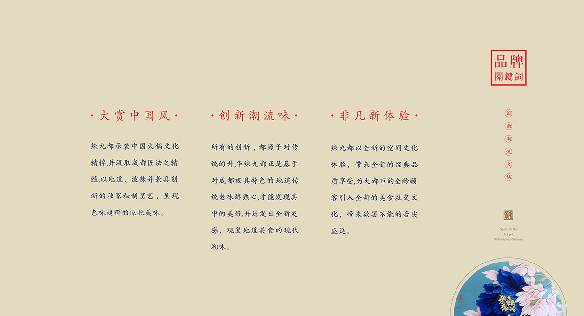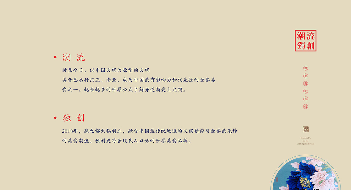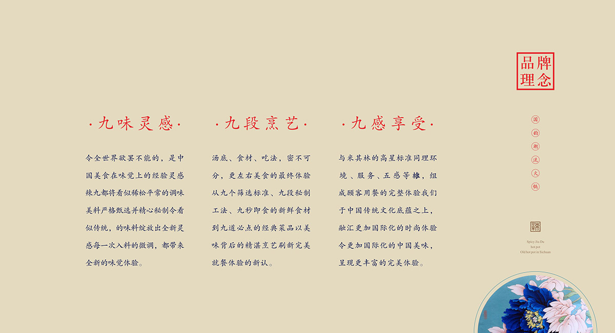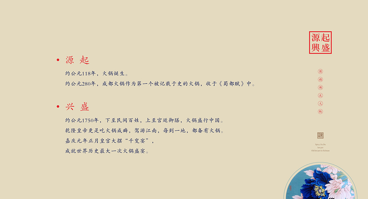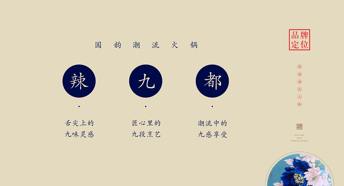 約公元118年,火鍋誕生。公元280年,成都火鍋?zhàn)鳛榈谝粋€(gè)被記載于史的火鍋,收于《蜀都賦》中。在火鍋盛行的今天,以火鍋為原型的火鍋美食已盛行東南亞,南非,成為中國(guó)最有影響力和代表性的世界美食之一。越來越多的各國(guó)美食愛好者也都愛上了中國(guó)火鍋。2018年,辣九都火鍋店正是啟動(dòng),融合中國(guó)最傳統(tǒng)地道的火鍋精髓與世界美食潮流,獨(dú)創(chuàng)出最符合現(xiàn)代人口味的世界美食餐飲品牌?;疱伒闢I設(shè)計(jì)方面,是將中式傳統(tǒng)圖案與中國(guó)的書法藝術(shù)的一次完美演繹,將中國(guó)的古老傳承賦予了新的時(shí)尚氣息。把火辣的四川火鍋與皇室都城的高貴緊密相連,傳達(dá)出了辣九都火鍋店的熱情和高貴。