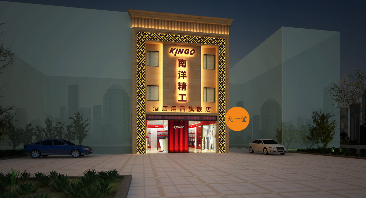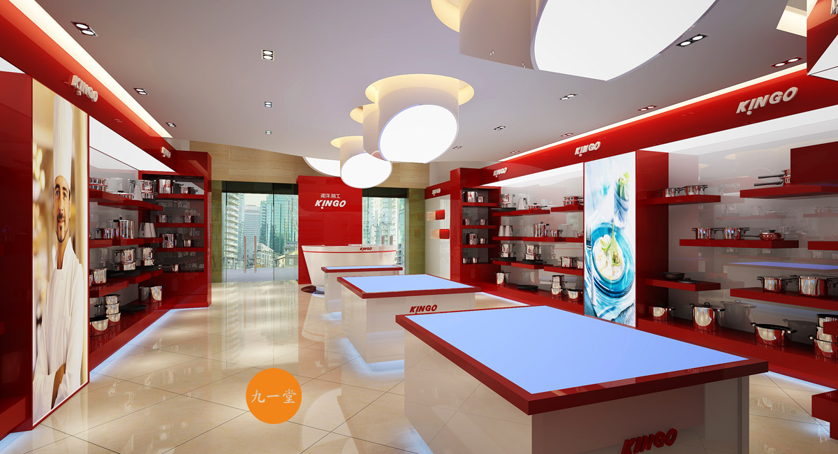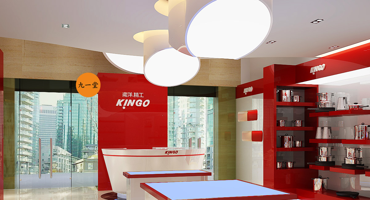 南洋精工是一家提供星級酒店設備用品的品牌公司,九一堂品牌設計對本案進行研究討論后,決定以提升整個品牌氣質為主,在色彩上加入流行色玫瑰金,把整個展廳的色彩比例調整為60%白色,35%紅色,5%金色。金色在整個品牌氣質里起到了畫龍點睛的作用。而在整個展廳設計中,為了更好展示不銹鋼材質,巧妙用了展柜發(fā)光以及對展柜下面使用氛圍燈光的手法,室內展柜材質則多用亮面烤漆來表現,增強與產品本色不銹鋼材質的對比,更好的突出產品特質。整個門頭則用米黃色石材,與星級酒店的大氣高品質做呼應,體現南洋精工的品牌核心價值。
