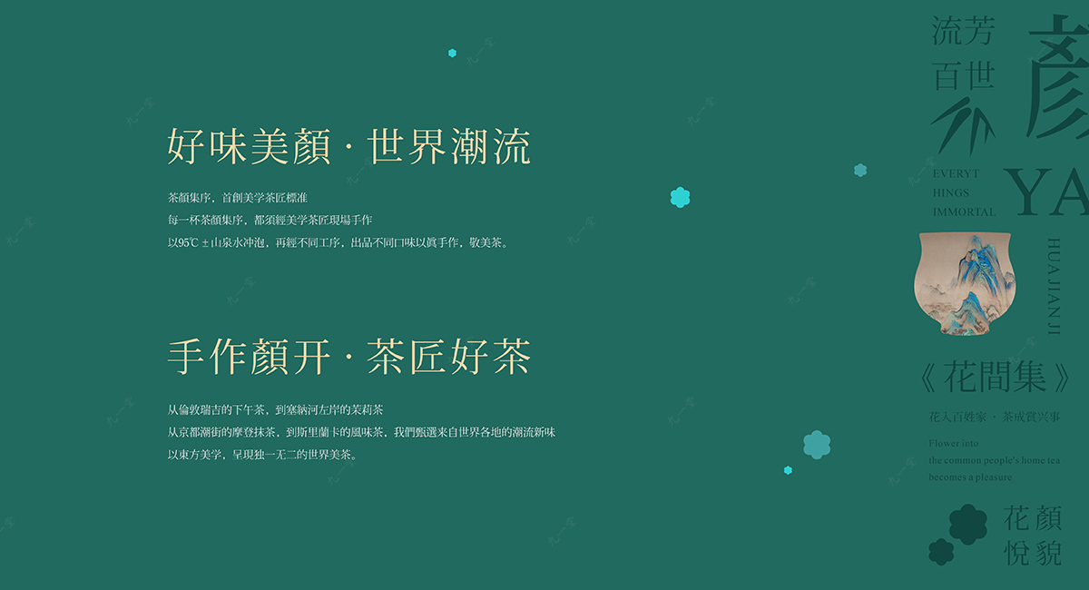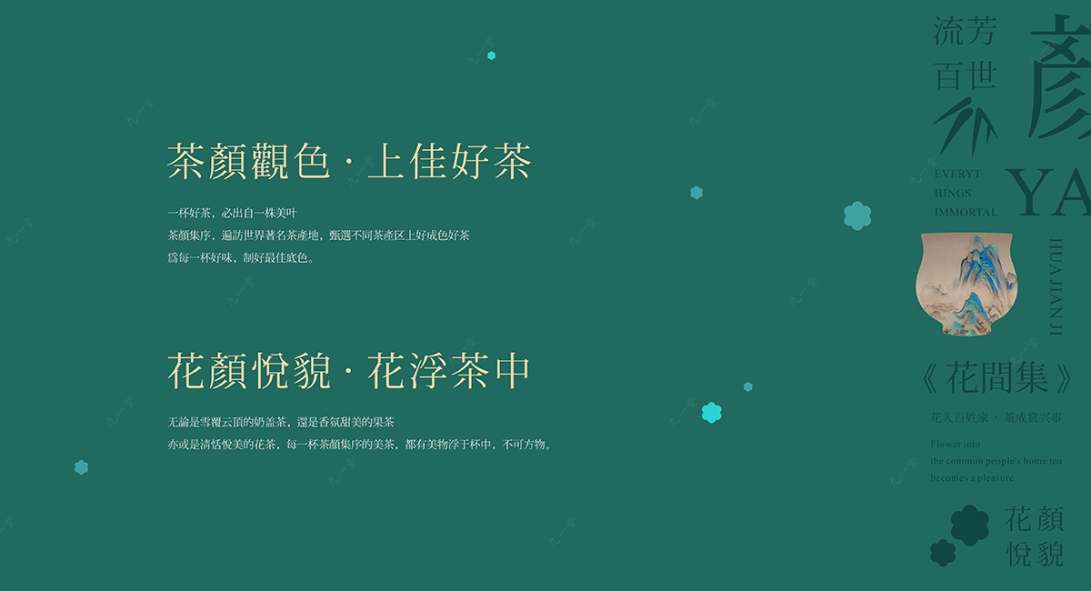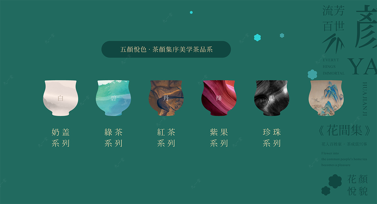 從倫敦瑞吉的下午茶,到塞納河左岸的茉莉茶,從京都潮街的摩登抹茶,到斯里蘭卡的風味茶,我們甄選來自世界各地的潮流新味,以東方美學,呈現(xiàn)獨一無二的世界美茶。九一堂此次設(shè)計打造的茶顏集序美學茶飲品牌,區(qū)別于傳統(tǒng)茶飲,提出美學茶品這一觀點,以東方美學呈現(xiàn)獨一無二的世界美茶,重新喚起茶飲品牌的東方至美風潮。