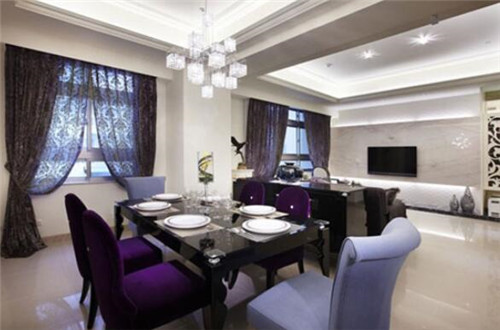 如果家里的空間較小,無法獨(dú)立安排出一個(gè)空間作為飯廳的話,不妨借鑒下這張圖中的設(shè)計(jì)。主人采用了黑色的矮柜作為分隔,既保證了空間的獨(dú)立性,有保證了室內(nèi)空間的開闊性。餐廳布置得極為雅致,黑色木餐桌搭配上紫色的沙發(fā)餐椅顯得浪漫又低奢,彰顯出主人不凡的品味。