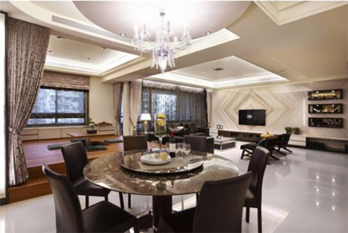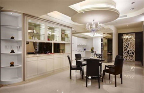 假如您家里的空間允許的話,那么就可以單獨(dú)隔出一個(gè)區(qū)域作為餐廳了。圖中是一款非常雅致的餐廳,頗具層次性的設(shè)計(jì),讓餐廳的典雅平衡入口處的華麗氣勢(shì),尤其古典美的圓弧天花、餐桌,細(xì)致的線條層層圍起,柔化了視覺沖擊力,并以金貝沙石材為臺(tái)面,帶出古典質(zhì)感。